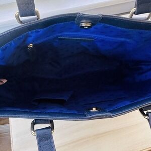Perfect for travel, workwear, casual and business occasions, this bag is a must-have for every fashion-forward woman. The blue lining adds a pop of color while the exterior leather material is both stylish and durable. The bag is brand new without tags and is sure to make a statement with any outfit.
