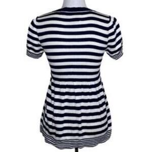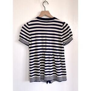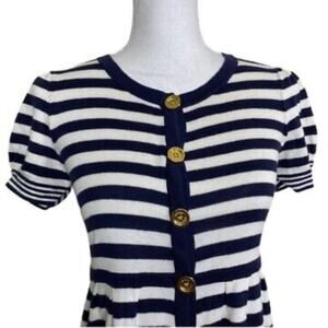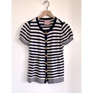 A cute navy and white 100% cotton knitted top by Juicy Couture with a button-up front and shining gold hardware. Lightly pleated at waist.