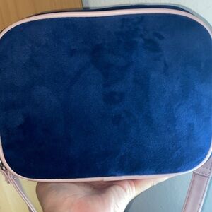 Stylish Juicy Couture crossbody with navy velvet and blush accents. Features elegant gold embroidery and heart detail.