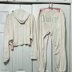 NWT Juicy Couture Pajama Set. These hooded pajamas are soft and plush, with a beautiful white/off white color. Juicy logo written in script on front of shirt and back of pants, Juicy Couture written in script on drawstring of hoodie and on waistband, pants also have side pockets. Can be worn as outside wear if you choose.