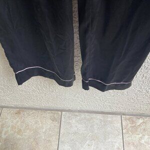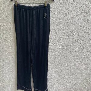 SEE PHOTOS, no rips or stains. Gently worn, silky, feels like silk. At worst, wrinkles that will come our when washed or in dryer. This Juicy Couture pajama set in a size L features a black color with a crown embellished logo design. The set includes long pants with elastic waist, and a collared neckline. Made from a polyester spandex blend jersey fabric, the lightweight pajamas are machine washable and ideal for year-round use, showcasing a designer, classic, and fun theme. Perfect for women who appreciate both style and comfort in their sleepwear. SORRY DO NOT GIVE MEASUMENTS ON SLEEP WEAR, so please know your size in this brand as they do run true to size. SMOKE FREE HOME.