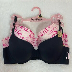 Juicy Couture Pink Logo Print & Black Push-Up Bra Set NWT Size 38C