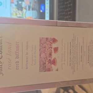 Chic reed diffuser with floral and melon notes. Stylish pink design.