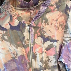 This Juicy Couture bomber jacket features a vibrant blend of pink and purple hues, crafted from a silky material that drapes elegantly. Its artistic, watercolor-like pattern adds a unique touch, making it a standout piece in any wardrobe.