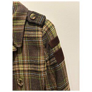 Elevate your fall and winter wardrobe with this chic and vintage-inspired plaid peacoat from Juicy Couture! This structured jacket features rich brown, green, and mustard plaid, with velvet shoulder and sleeve accents for a stylish and sophisticated touch.