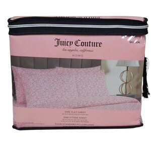 Embrace a touch of fun and style in your bedroom with the Juicy Couture Queen Sheet Set. This set features a playful pink peppermint pattern, adding a dash of whimsy to your sleep space. Designed for both comfort and fashion, it includes one flat sheet, one fitted sheet, and four standard pillowcases.