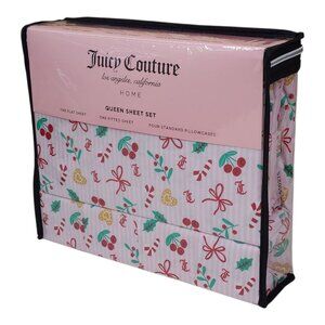 This festive sheet set by Juicy Couture brings holiday cheer to your bedroom. Featuring a playful Christmas candy cane and cherry pattern on a pink base, it includes a flat sheet, a fitted sheet, and four pillowcases. Crafted for comfort, it fits a queen-sized bed perfectly.