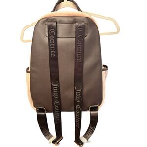Juicy Couture “Queen of Everything” square backpack in dusty blush velour with black trim. Features gold-tone hardware, heart charm zipper pull, logo straps, and matching round coin pouch. New with original tags.