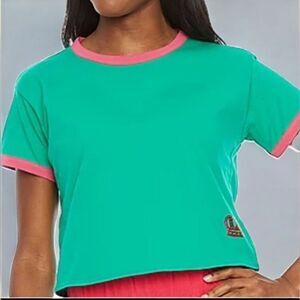 Stylish teal cropped t-shirt with pink trim. Perfect for casual wear.