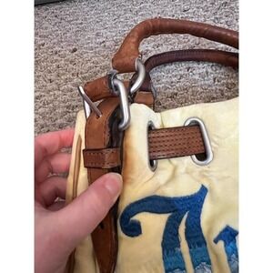 This is well loved and does have some marks throughout the bag- please see all photos I have not tried to get any of the marks out. Measurements are included in photos. Inside is pretty clean