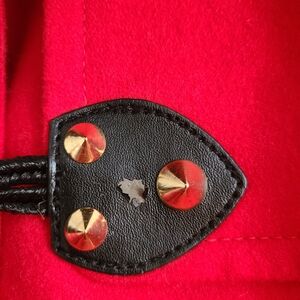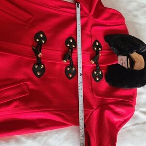 Chic red pea coat with black toggle closures and a faux fur black collar. Ideal for a fashionable look. New without the tag, but the faux leather on one small spot is peeling. See the close picture of it.