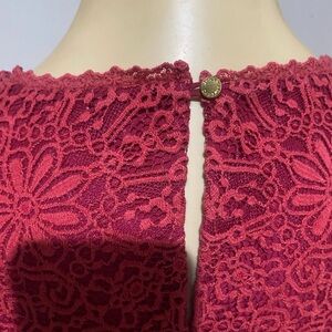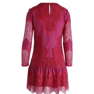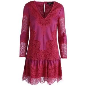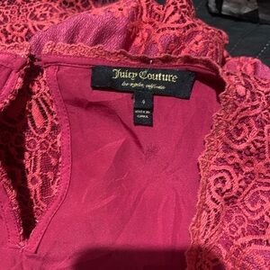 This stunning Juicy Couture dress in a bold red color showcases a chic sheath style with 3/4 sleeves and a crew neckline. Ideal for cocktail events, it combines elegance and sophistication with its fitted design and intricate lace details.