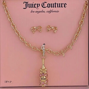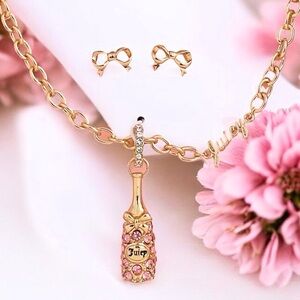 Juicy Couture Rhinestone Pink Champagne Bottle Necklace & Bow Earrings Gift Set