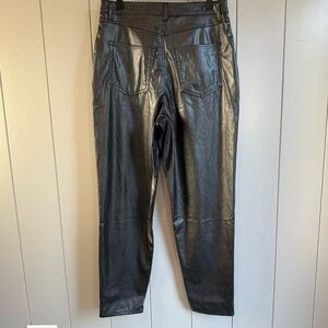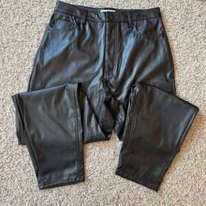 Sleek and stylish black faux leather pants with a skinny fit. Features a classic 5-pocket design, zip fly with button closure, and smooth leather-look finish. Perfect for a night out, casual chic outfits, or adding an edgy touch to your wardrobe.