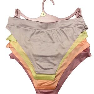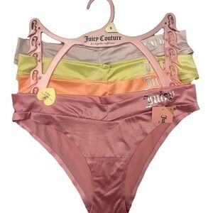 Set of Juicy Couture satin panties in pink, orange, and yellow.