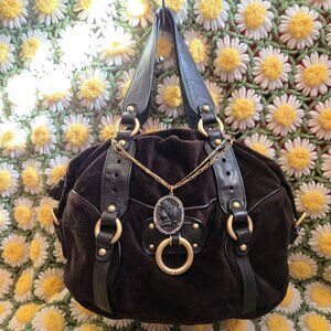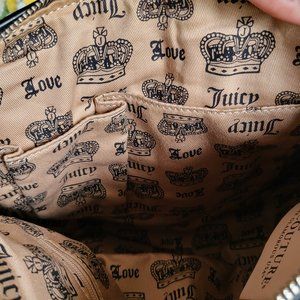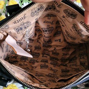 * Bag is stuffed to show shape* Juicy Couture handbag with gorgeous embroidery! The detailing of the logo is so unique and really stands out against the black velour. Silver hardware throughout. Features a cascading silver ball bag charm. Interior consists of pockets that match the repeating text of the entire lining. โ— Any imperfections pictured above ๐Ÿšญ Smoke-free | ๐Ÿพ Pet-friendly ๐Ÿพ Home