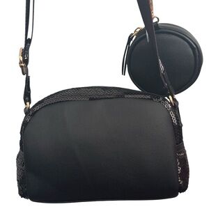 Stylish black crossbody bag with shimmering sequins and gold hardware. Includes a matching coin pouch. Perfect for adding sparkle to any outfit.