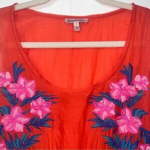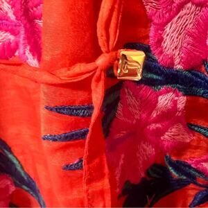 Bright Vibrant Coral With Bright Embroidered Flowers.