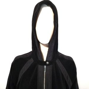Very gently previously loved! Black terry cloth track jacket, front zip hoodie, sweatshirt. 100% silk accent panels, cuffs and hem. Older label with terriers (holds it's value to Juicy lovers).