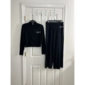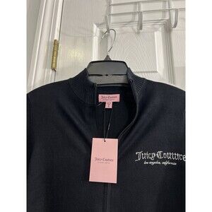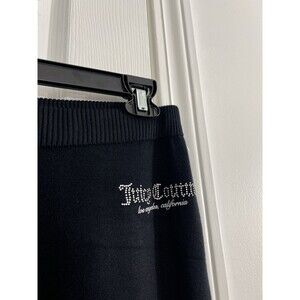 New with tags Juicy Couture knit tracksuit set in the color Liquorice. This elegant black set includes a ribbed zip-up mock neck sweater and matching wide-leg pants. Both pieces feature the signature rhinestone Juicy Couture, Los Angeles, California logo for a chic and timeless look. The soft stretch knit fabric offers a flattering and comfortable fit, perfect for lounging or casual wear.
