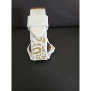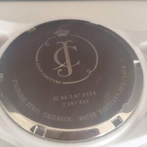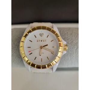 Juicy Couture Sport women's watch is gold tone jeweled bezel, white dial and a silver heart at 12:00. Silicone band has a gold scatter animal print and a cute heart by the clasp. Very good pre-owned condition. Currently running with a fresh battery.