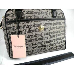This stylish and sophisticated accessory set from Juicy Couture features a satchel and matching clutch, adorned with the iconic logo print. Designed with black faux leather handles and gold-tone accents, the satchel offers functionality and elegance. The clutch complements the set with a chic design, perfect for transitional day-to-night use.