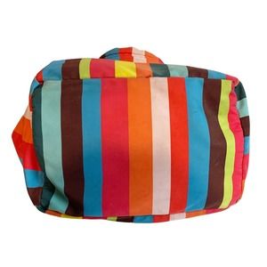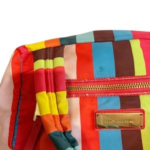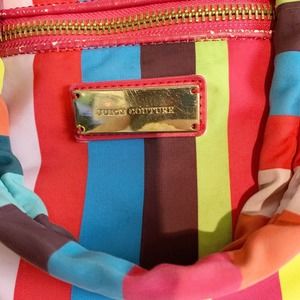 Juicy Couture fabric striped purse. Rare style. Colorful and bright, logo on gold tone hardware on front. Good preowned condition, some wear to purse and stin on front as shown. Interior in good condition.