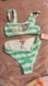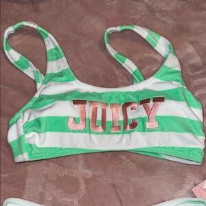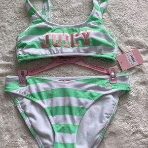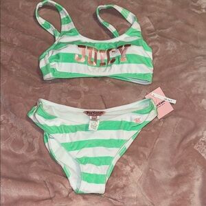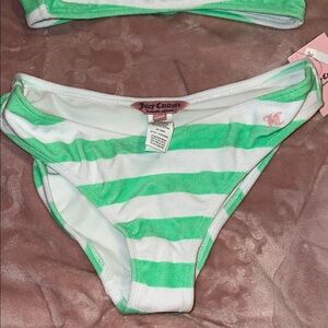 Mint and white striped swimwear by Juicy Couture. Features bold logo on top.