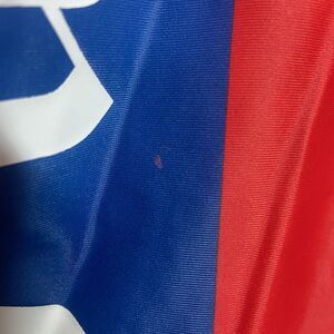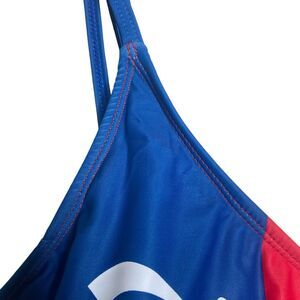 This Juicy Couture one-piece swimsuit in size L features a stylish colorblock design in red and blue with spaghetti straps and a scoop back. The swimsuit is made of polyester and spandex, offering a comfortable and breathable fit with light padding and removable pads. Perfect for the beach or pool, this designer swimsuit is lined and has a cheeky swim bottom style, making it a bold and patriotic choice for summer days.