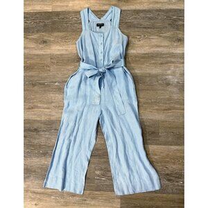 One end of sash belt has some staining, as shown, otherwise, Excellent condition. Retailed for $188! This is SUPER RARE and EXTREMELY hard to find. Color name is "Blue Chill" and this is their washed linen jumpsuit. Legs are wide leg, cropped with a loose/oversized fit. Front slash pockets; detachable sash tie belt; front button closure. Lovely!