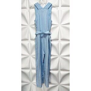 One end of sash belt has some staining, as shown, otherwise, Excellent condition. Retailed for $188! This is SUPER RARE and EXTREMELY hard to find. Color name is "Blue Chill" and this is their washed linen jumpsuit. Legs are wide leg, cropped with a loose/oversized fit. Front slash pockets; detachable sash tie belt; front button closure. Lovely!