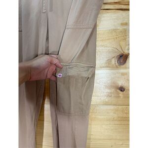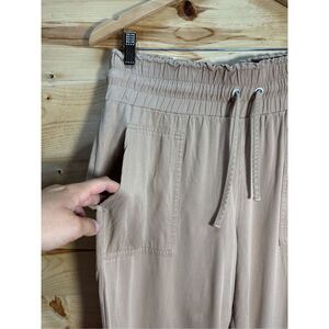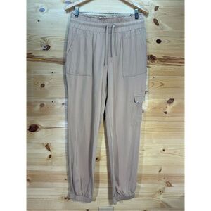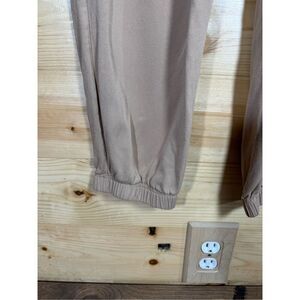 Stylish tan track pants. Features elastic waistband and cuffs. Comfortable fit.