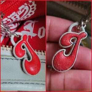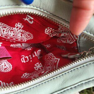 Vibrant red bag with leather details. Silver hardware. Strap is adjustable. 1 interior zipper pocket. Both "J" zipper pulls have a residue to them. I"ve refrained from trying to fix them as I haven't found the perfect solution to not make them stickier afterwards.
