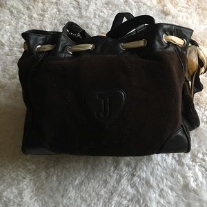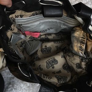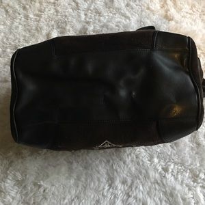 Black and brown purse, vintage but well kept, really clean on the inside and out, two pouches and a pocket that zips on the inside, an attached mirror that is worn (the only thing that is well worn on the purse), small side pocket on the outside of the purse, magnetic closure
