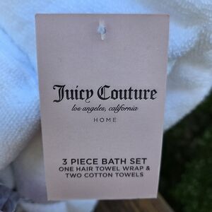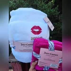 So cute White and pink set. Towel set includes 2 towels and a hair wrap. Vibrant pink washcloths by Juicy Couture includes 4 washcloths. Soft and luxurious feel.
