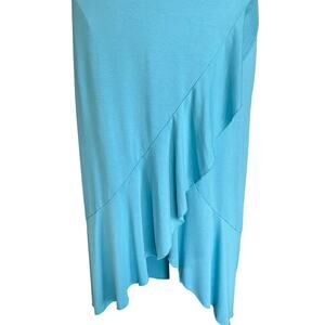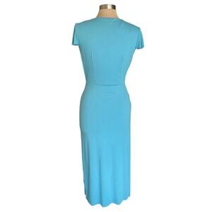 Juicy Couture Turquoise Faux Wrap Midi Dress Knit Ruffle Asymmetric Hem Sz MEDIUM. V-neck with snap for secure closure. Flutter sleeve. Feminine cut. Soft knit fabric.