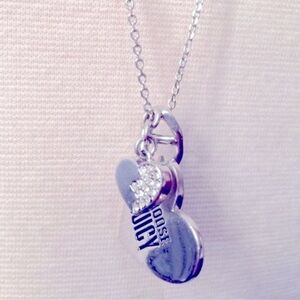 The simple and sweet Juicy Couture Dog Tag Necklace features a smooth, silver-toned brass heart with the iconic statement "Choose Juicy" engraved on its surface. A second heart that's meant to resemble a dog tag also dangles from the silver-toned chain. It features sparkling clear crystals on one side for added glamour.