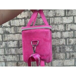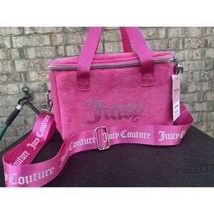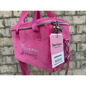 Stylish and functional Juicy Couture cooler bag in signature pink velour with sparkling rhinestone Juicy logo on front. Perfect for keeping drinks or snacks cold or warm on the go. Features a silver zip closure with heart-shaped pulls, removable logo shoulder strap, and easy carry handles. Holds up to 6 cans ideal for travel, lunch, or everyday glam.