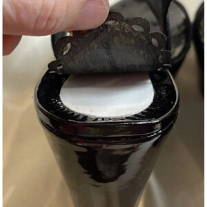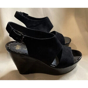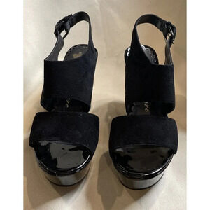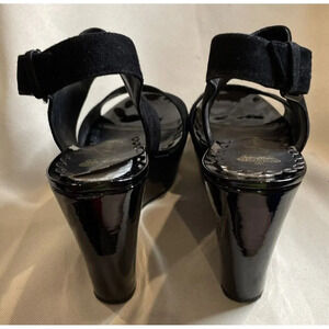 Juicy Couture Women’s 8 1/2 M Peep Toe Wedge Ankle Strap Sandals Black Patent