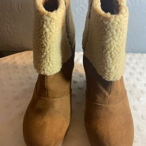 Faux-shearling cuff Buckle detail ''Juicy Couture'' heel placket Treaded sole BOOT CONSTRUCTION Microsuede, faux-shearling upper Textile lining TPR outsole BOOT DETAILS Round toe Pull on Padded footbed 4-in. wedge 1-in. platform 4-in. shaft 12-in. circumference, excellent please see ALL