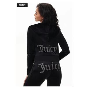 Iconic Juicy Couture velour set featuring a black bling-accented zip-front hoodie and matching velour pants for a classic Y2K lounge look. Soft, stretchy, and ultra-comfortable with signature glam details. Perfect for travel, errands, athleisure outfits, or elevated loungewear. A stylish matching set that delivers cozy luxury with classic Juicy attitude.
