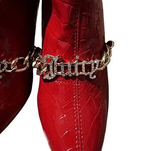 Juicy Couture boots, red croco boots, women's designer boots, gold chain boots, logo accent boots, stylish ankle boots, mid-calf boots, Juicy Couture footwear, size 7.5 boots, red boots for women, patent leather boots, trendy boots for women, Juicy Couture red boots, sexy, date night, jeans, party, event, girls weekend, dancing, club, holidays, work party, date night, party, event, girls weekend, summer, winter, fall, spring