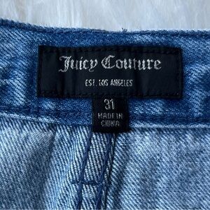 Keywords: Juicy Couture, relaxed jeans, blue tie-dye, medium wash, 5-pocket design, casual wear, women's jeans, size 31, denim, machine washable, button closure, all seasons, comfortable fit, versatile style, new with tags. Measurements in photos