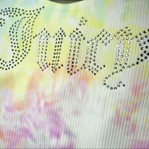 From our Forever 21 x Juicy Couture collection, this ribbed knit one-piece swimsuit features front "Juicy" text written in rhinestones, a tie-dye cloud wash, scoop neckline, low scoop back, dropped armholes, high leg cut, and a cheeky/thong back. Gives off totally 80s vibes!