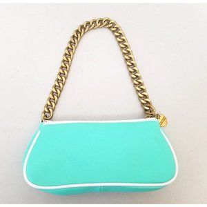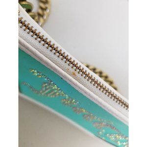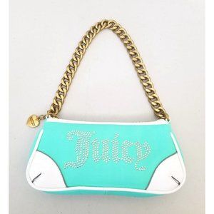 Carry your cute essentials in true Y2K style wearing this baguette bag from Juicy Couture. Constructed of faux leather with mint green panels and a rhinestone ‘Juicy’ logo, finished with a printed liner, chunky chain strap and heart logo pendant zipper