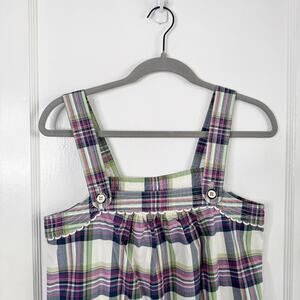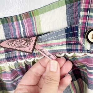 Juicy Couture Y2K McBling Colorful Jumper Mini Dress Plaid Pastel Size 4 {Four} Oughts 2000s. Very good, preowned, vintage condition. Some normal fading to coloring and fabric from normal wash and wear and age. Straps secured with large, shiny buttons. Piping at bustline. Square neckline. Piping at hemline. Purple, green, white, pink in design. Side seam slip pockets. 97% cotton/3% spandex. Machine wash. Tumble dry. This item was made between 2007 and 2010 per the brand tag.