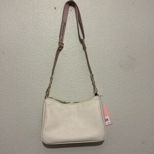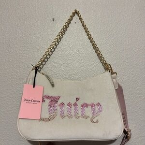 This Juicy Couture shoulder bag combines elegance and style with its white and pink color scheme. The bag features a striking 'Juicy' design in pink glittery letters on the front, adding a touch of glamour. A gold-toned chain and adjustable strap offer versatile carrying options, making it a perfect accessory for any occasion. Detachable Straps NWOT