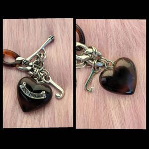 Super rare 2000s Juicy silver tone necklace with tortoiseshell/root beer colored accents and heart puffy heart and "J" starter charm necklace. Toggle closure. 15.5" long.
