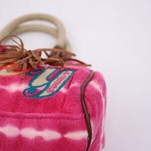 Juicy Couture Mini Daydreamer Tote In Pink Tie-Dye Terry Cloth With Rope Handles, Faux Leather Trim, Tassel Charm, And Colorful “Juicy” Embroidery. Y2K Vintage Style. Excellent Condition