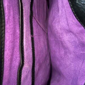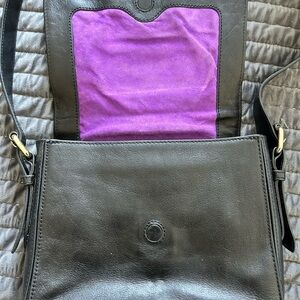 Black leather shoulder bag with black jeweled embellishment on the front. Purple suede interior. 3 compartments. Good condition.